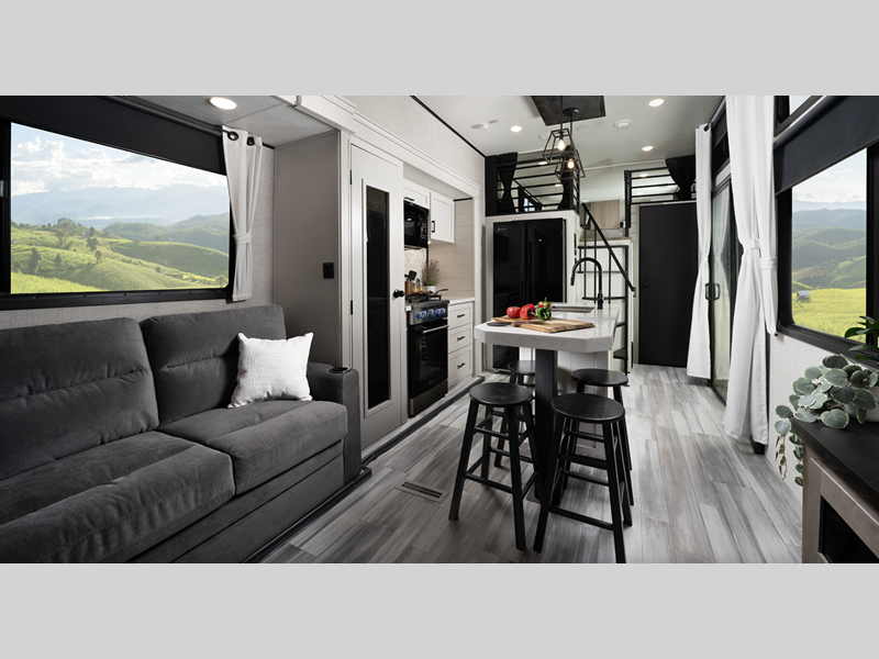 Durable construction begins with 12 inch I-Class cambered structural steel I-beams, a Magnum Truss roof system, and 5/8 inch tongue-and-groove plywood floor decking. You will appreciate the axles with electric, self-adjusting brakes and E-Z Lube hubs for smooth towing, and the insulated and enclosed underbelly within the Thermal Package will help extend your camping season. The interior will feel more like a home with hardwood look vinyl flooring, an electric fireplace, tall doorways and ceiling heights, and many more comforts.
