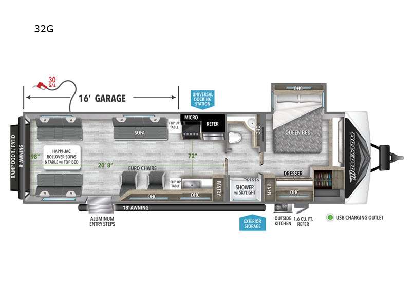 If 16' up to 20' 8" of toy parking space is what you need, and adventure is what you seek, then check out this Momentum G-Class toy hauler! The rear ramp door allows you to easily park your favorite off-road toys and take them to your favorite stomping grounds where you can kick back and relax in camp, or enjoy the trails with family and friends. Once you unload your toys and gear, you can set up the ramp patio with 8' awning to enjoy. Happi-Jac rollover sofas with a table between will provide a place to gather for a meal inside, and at night both can be turned into sleeping space for four tired campers with the Happ-Jac top bed lowered. There is another sofa and two Euro chairs for more seating inside this space each with flip-up tables nearby. A large walk-through bath provides a shower with skylight so all can get cleaned up and refreshed, and two will enjoy the private front bedroom featuring a queen bed slide with dresser and wardrobe space for all of your clothing. This unit also features an outside kitchen just off the 18' awning so you can enjoy as much outdoor time as you like.
