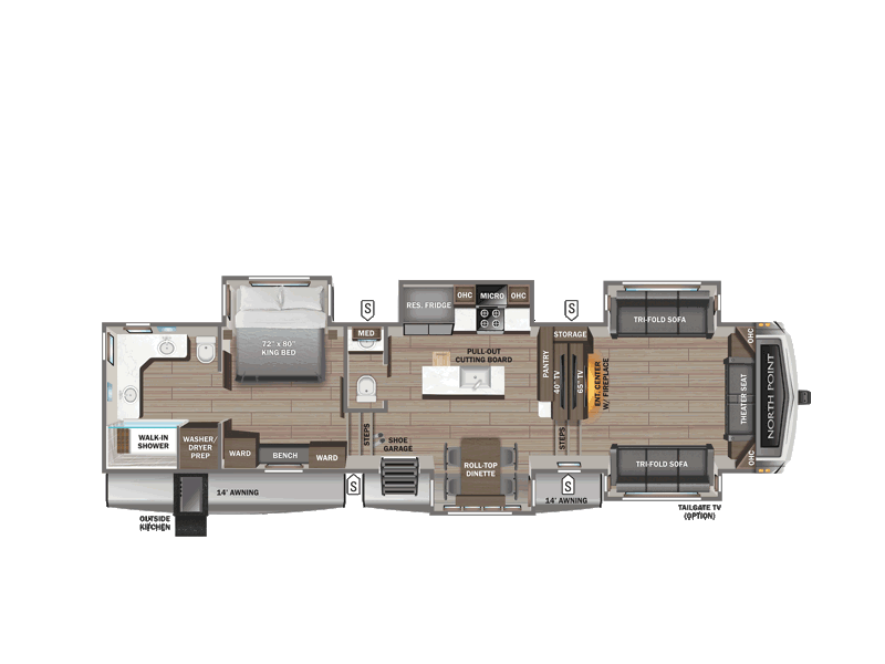 Overlander 4 Solar Package: (4) 200W solar panels, (2) 100-amp/hour lithium heated batteries, 60-amp controller, 3000W inverter, DC/DC power converter, soft start power save main 15K A/C, soft start power save for bedroom 15K A/C, battery monitor, energy management system, roof pre-wire for additional solar panels, generator prep capable and heavy gauge steel battery enclosure